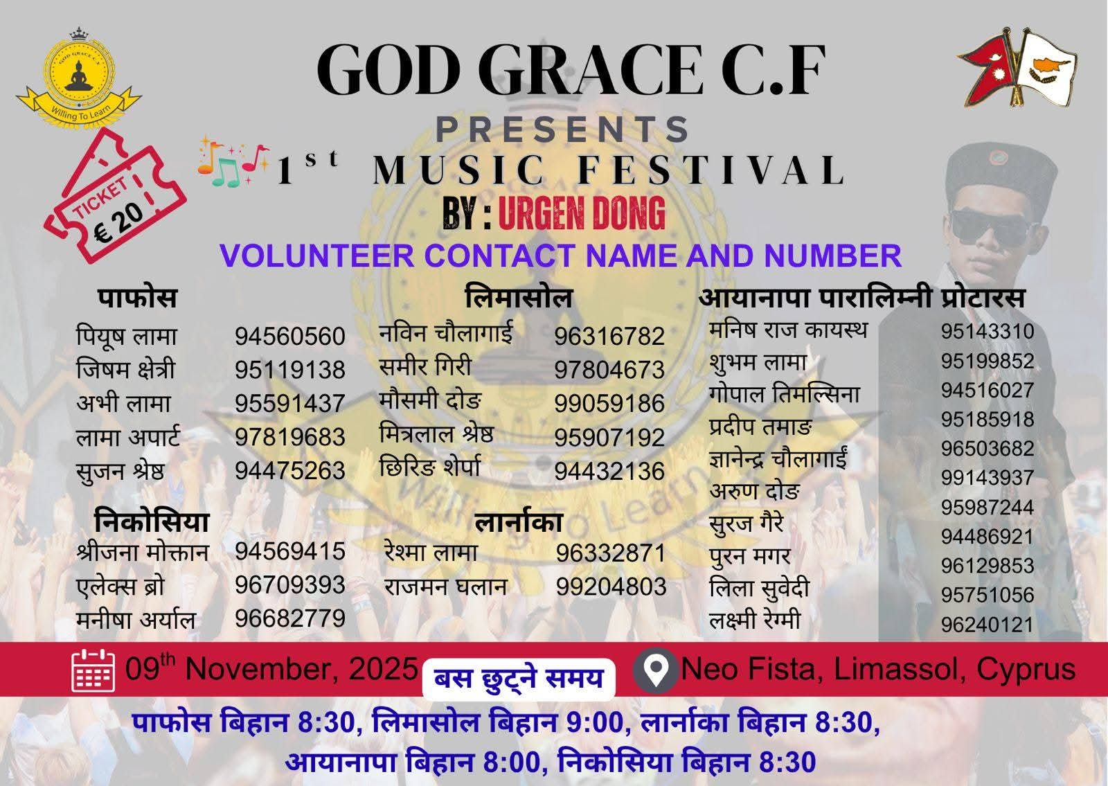 युवा माझ निकै लोकप्रिय बनेका गायक उर्गेन दोङ कार्यक्रमका लागि साइप्रस आउँदैछन् । गायक उर्गेन दोङलाई गड ग्रेस सिएफले ल्याउने भएको हो । कार्यक्रममा दोङले आफ्ना निकै चर्चित गीतहरू प्रस्तुत गरेर उपस्थित दर्शकलाई मनोरञ्जन दिनेछन् । साथमा स्थानीय कलाकारहरूले पनि आफ्नो प्रस्तुति राख्ने कार्यक्रम तय भएको आयोजकले जानकारी गराएको छ ।